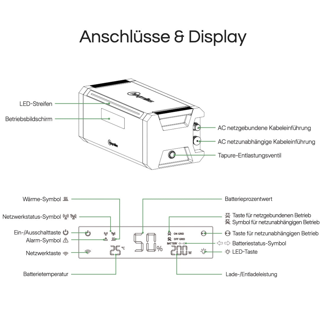 Nennausgangsleistung (zum Hausnetz) 800 Watt Maximale Eingangsleistung (vom Wechselrichter) 1800 Watt Batterie-Kapazität 1920 Wh Zelltyp LiFePO4 Haltbarkeit 6000+ Ladezyklen Ladetemperatur 0 bis 55 °C Entladetemperatur -20 bis +55 °C Drahtlose Verbindung Bluetooth, WLAN (2,4 GHz) Überwachung S-Miles Home App und/oder MQTT (ab Frühjahr 2026) Abmessungen und Gewicht